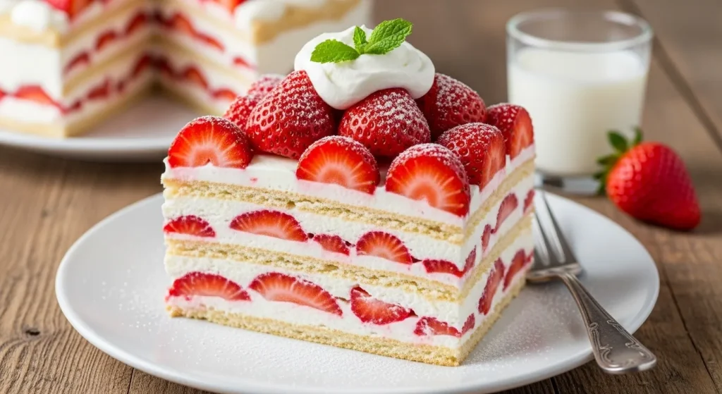 A simple yet impressive dessert made by layering cookies (like graham crackers or chocolate wafers) with sweetened whipped cream and fresh berries. The cookies soften overnight into a perfect cake-like texture.