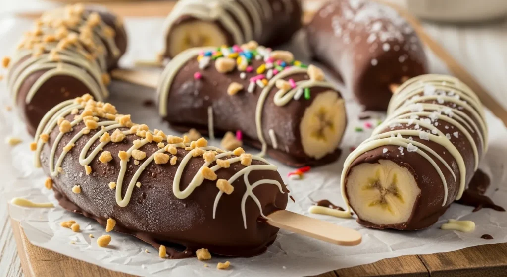 A healthy and refreshing treat. Banana halves are put on a stick, frozen, and then dipped in melted chocolate and toppings.