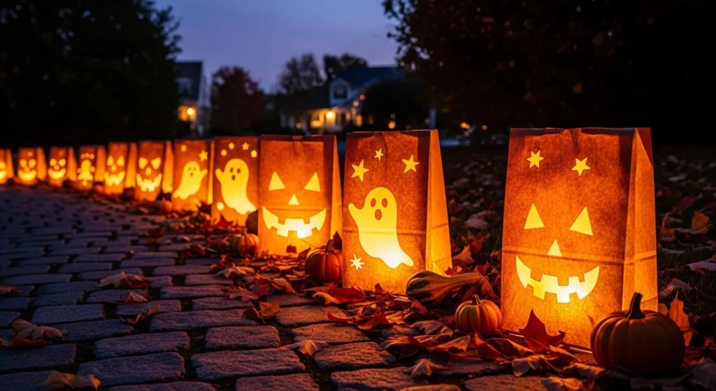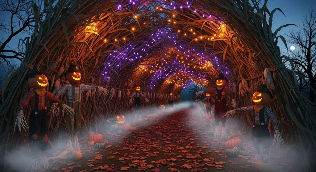 If you have a long walkway, create a spooky tunnel by lining both sides with dried corn stalks for an immersive, rustic horror experience.