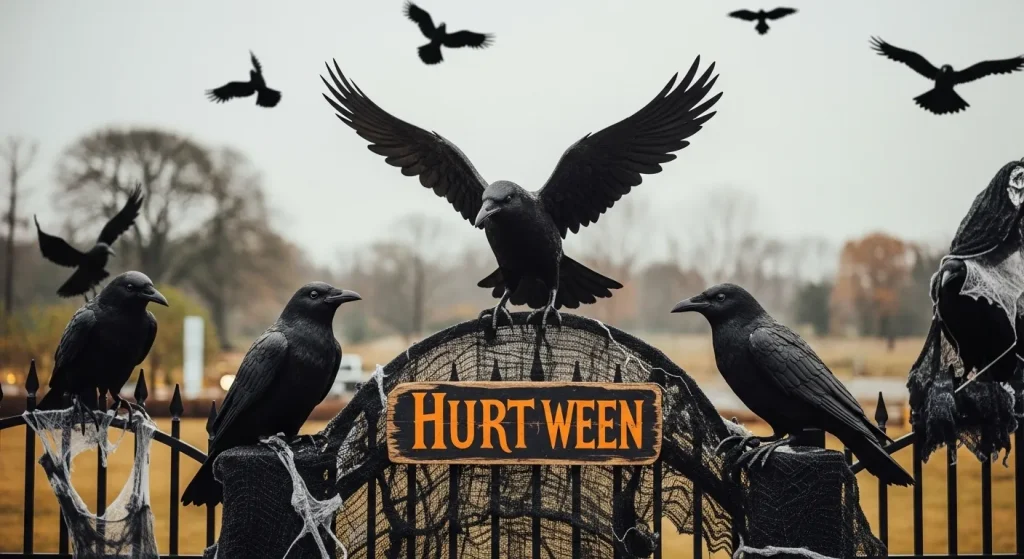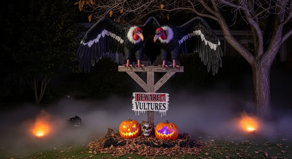 A few large, fake vultures perched on a fence or a low tree branch creates a sense of doom and decay that feels very intentional.