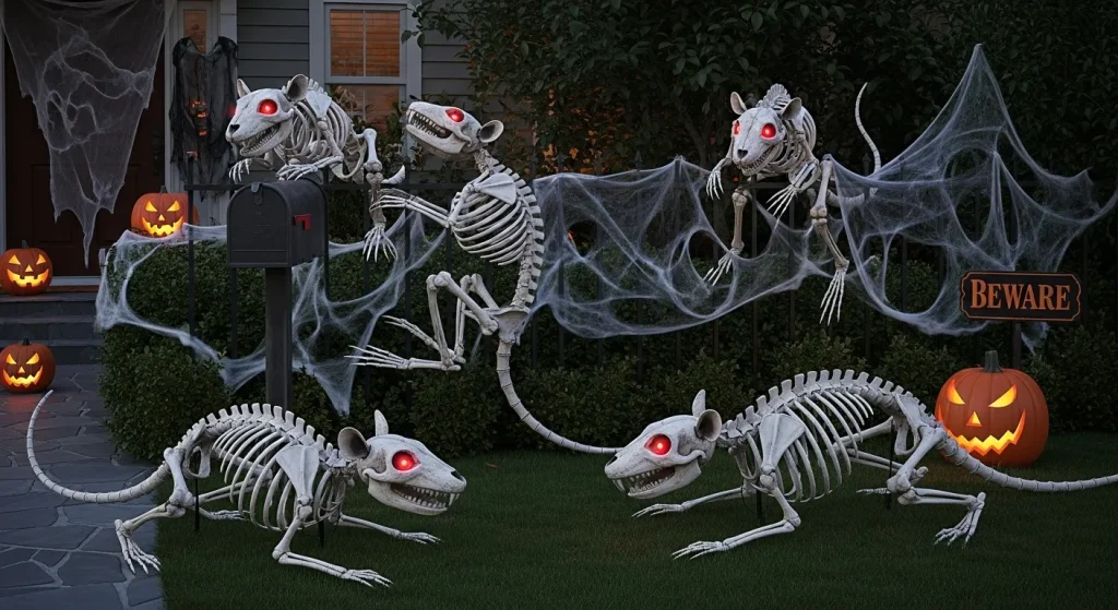 A few oversized, creepy rats peeking out from behind pumpkins or planters can be a very effective and startling scare.