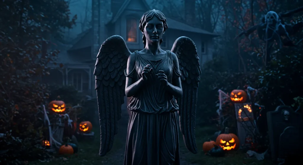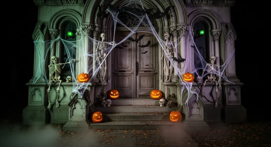 - Place two gargoyle statues or angel of death props on either side of the entrance.