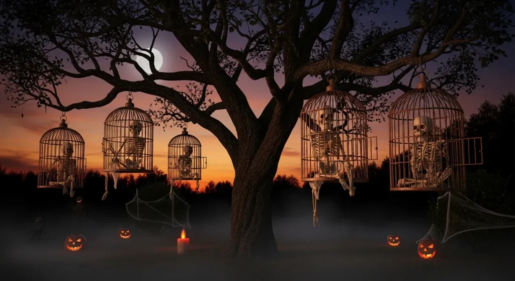 Create the look of a medieval dungeon or a mad scientist’s lab by hanging spooky cages from your trees.