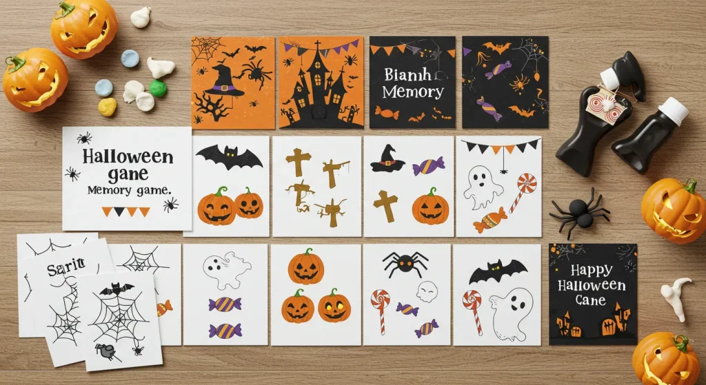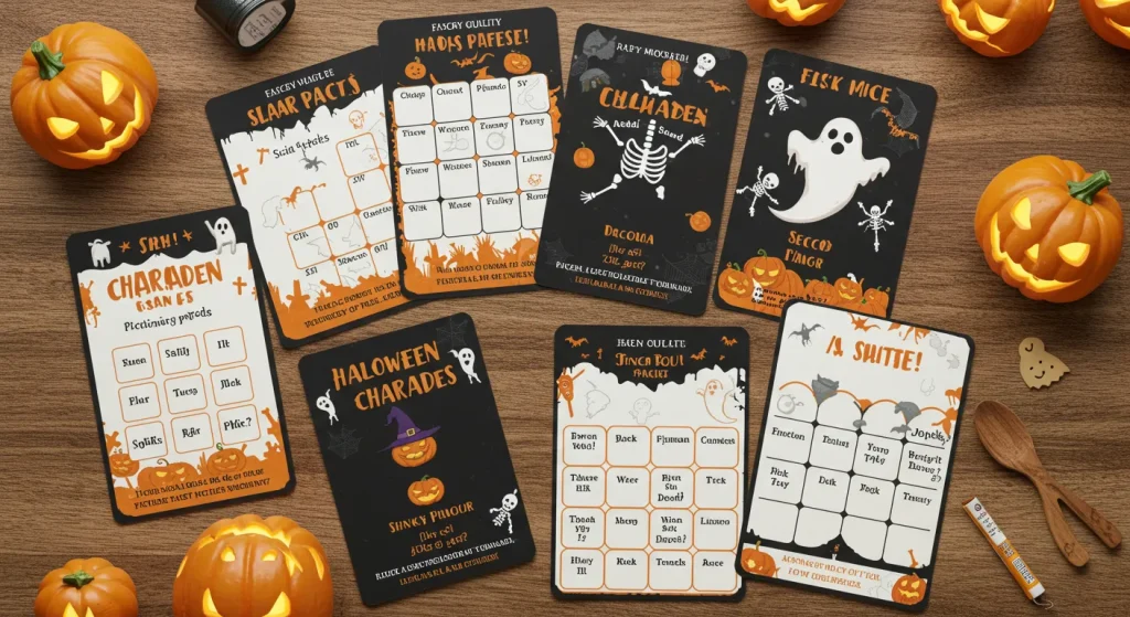 A set of printable cards with Halloween words and phrases for a classic party game.