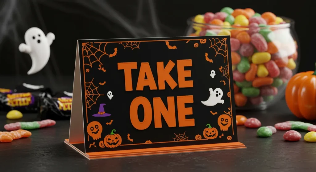 - Look for a sign with a fun, spooky font and a phrase like “Take One if You Dare” or “Poison… Just Kidding.”