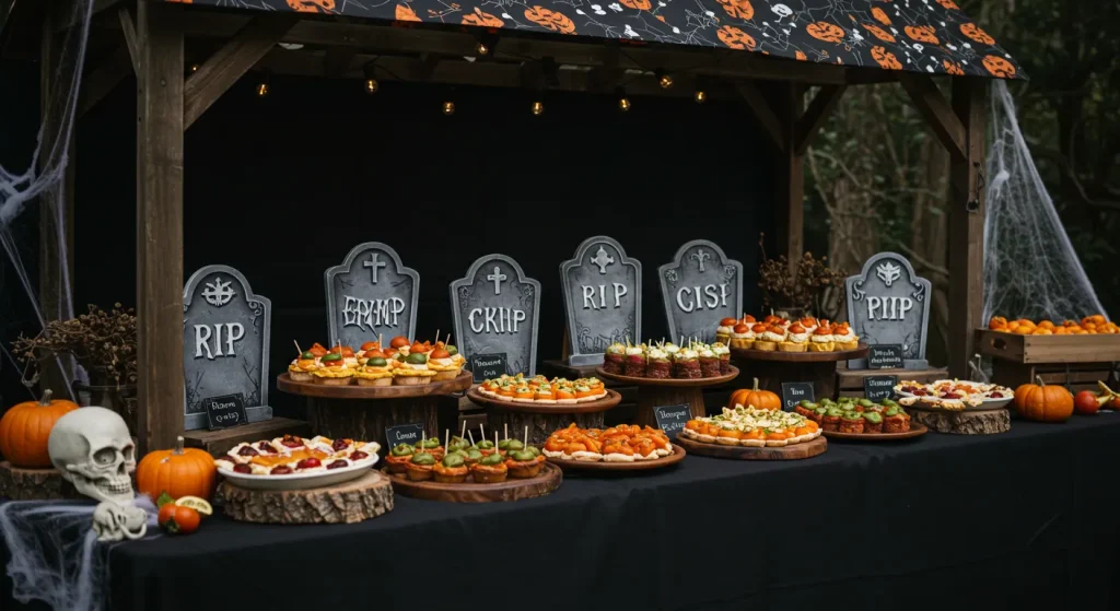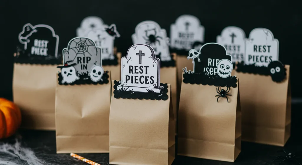 - Search for “free Halloween food tent printable” or “tombstone place card template.”