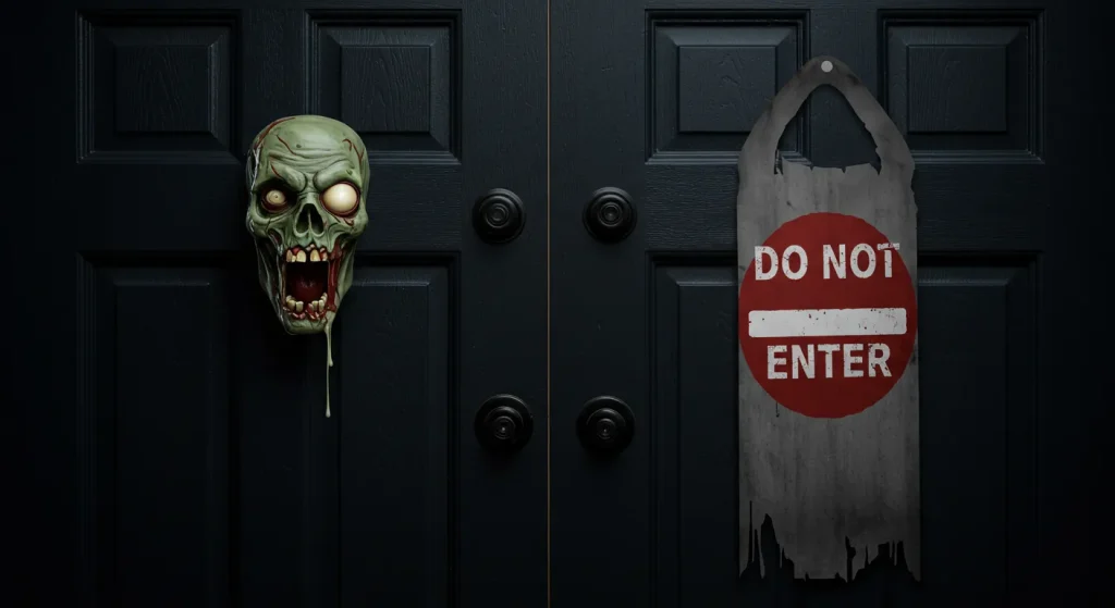 - Look for a design that says “Do Not Enter” and features bloody handprints and zombie silhouettes.