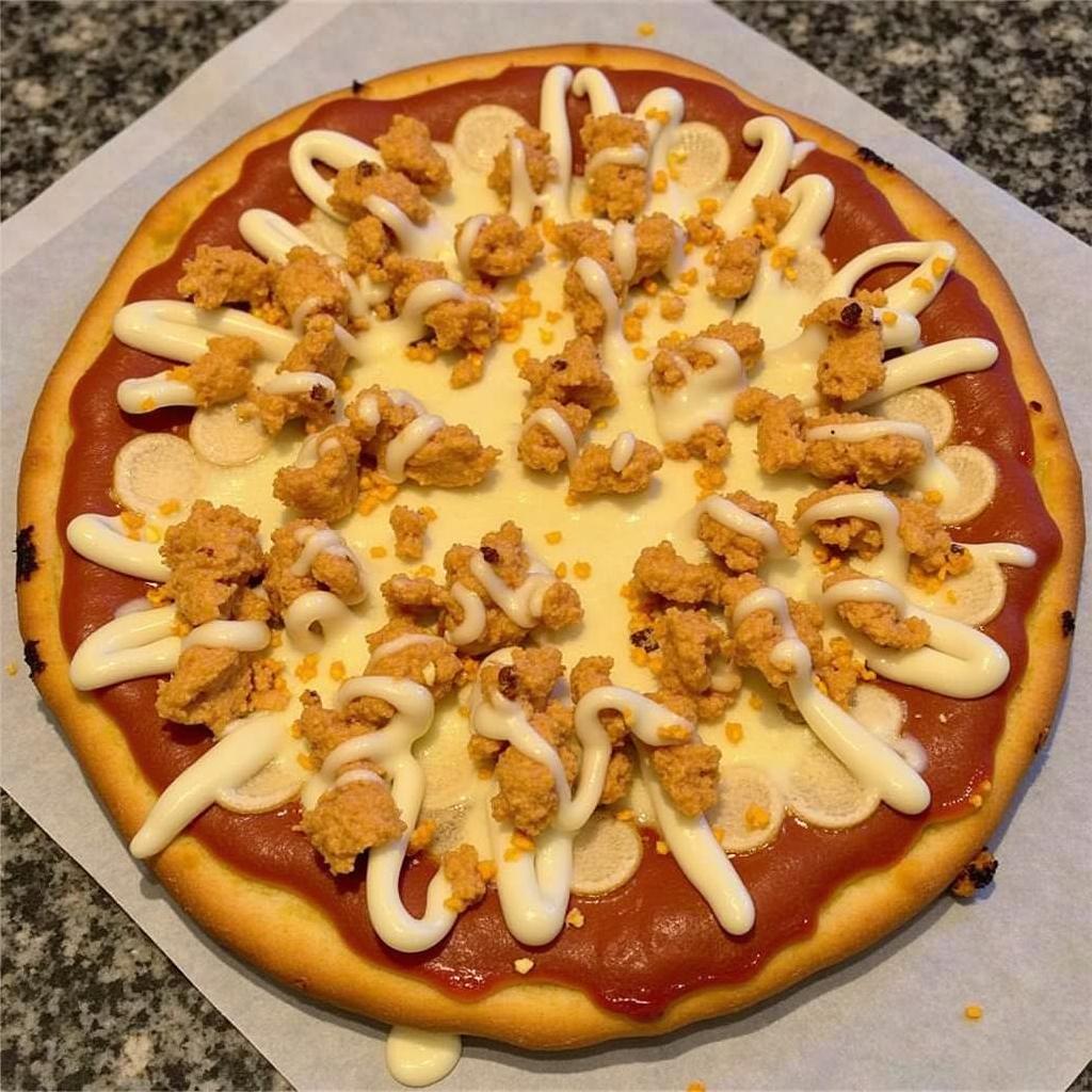 - Spread buffalo sauce on the dough, top with chicken, cheese, and dressing.
