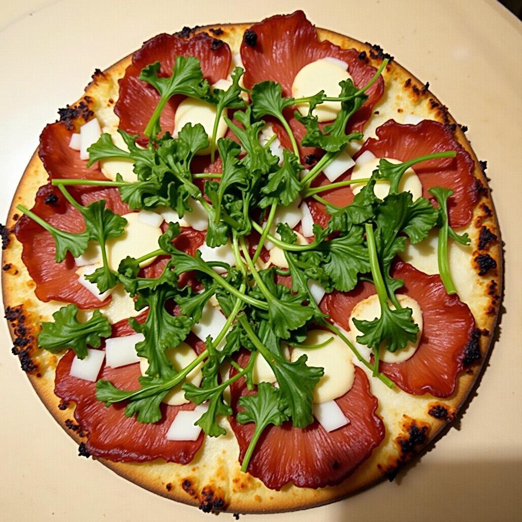 The salty prosciutto pairs perfectly with the peppery arugula, making this pizza a sophisticated choice.