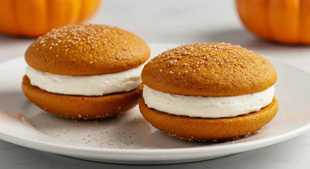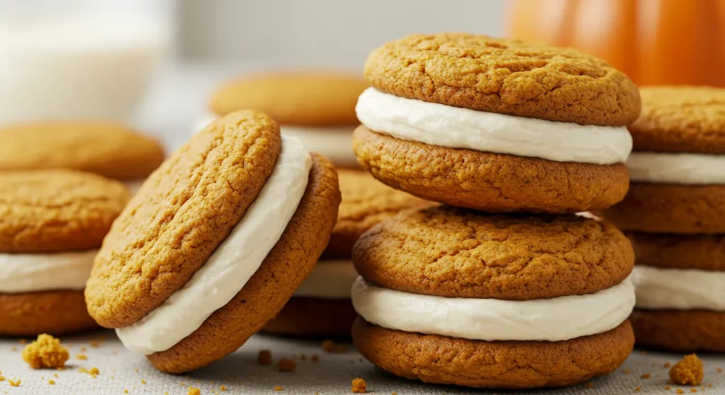 Two soft pumpkin cookies are sandwiched together with a delicious, tangy cream cheese frosting. A truly irresistible treat.