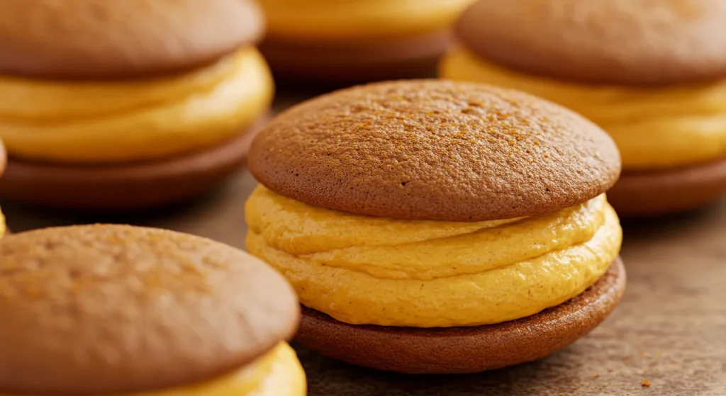 Two soft, cake-like pumpkin cookies are sandwiched together with a fluffy, tangy cream cheese filling.