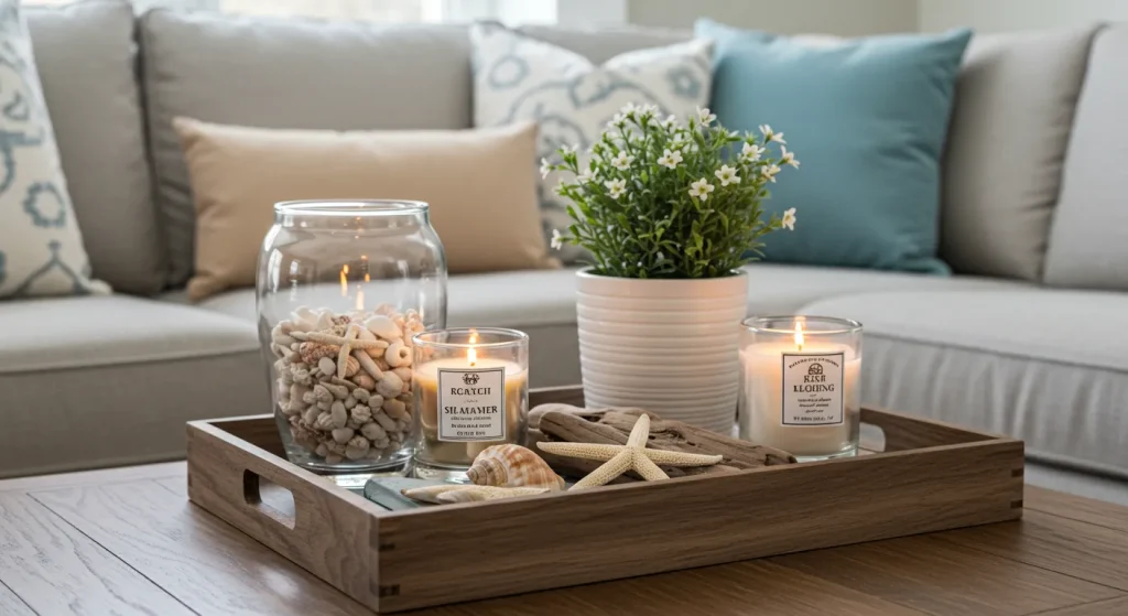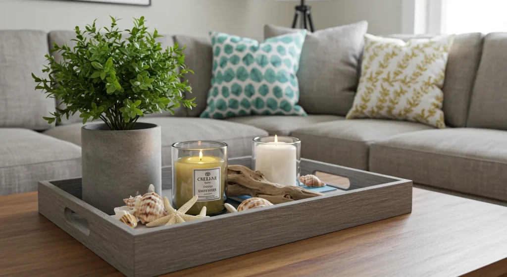 A well-styled tray on your coffee table or console can bring the whole look together. Include elements like seashells, driftwood, scented candles, or a small potted plant for a cohesive and stylish summer theme.
