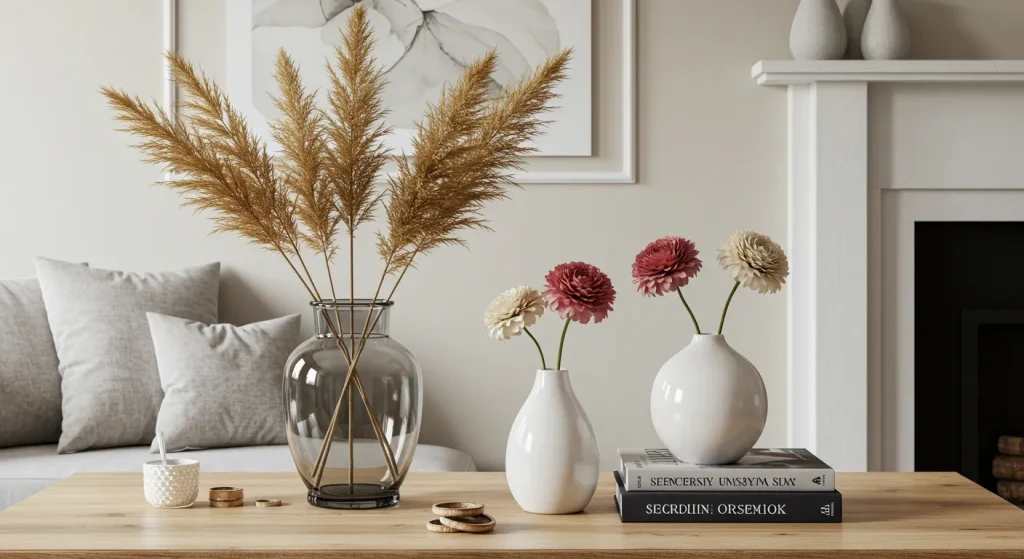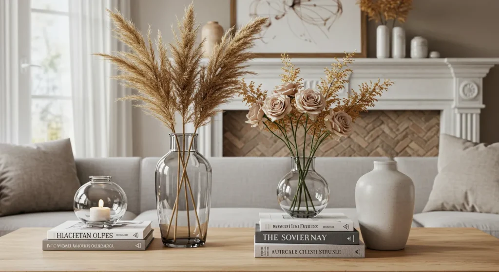Swap out bulky decor for delicate glass or ceramic vases filled with fresh flowers or dried pampas grass. These elements add a soft and elegant summer touch to coffee tables, shelves, and mantels.