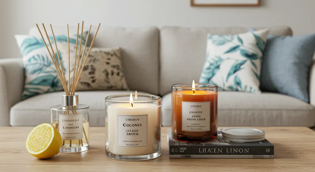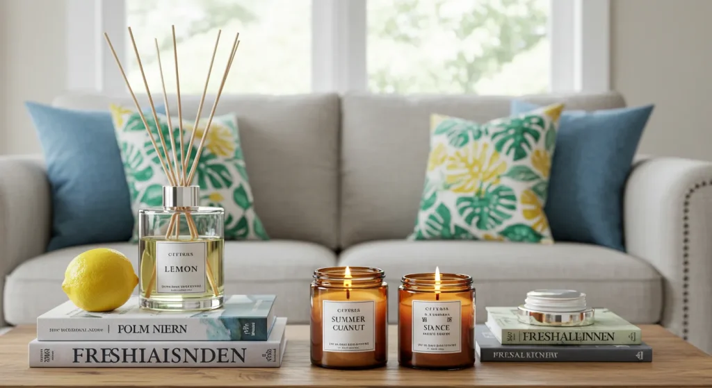 Fragrance plays a big role in setting the mood. Candles or diffusers with scents like lemon, coconut, lavender, or fresh linen create a refreshing summer ambiance in your living room.