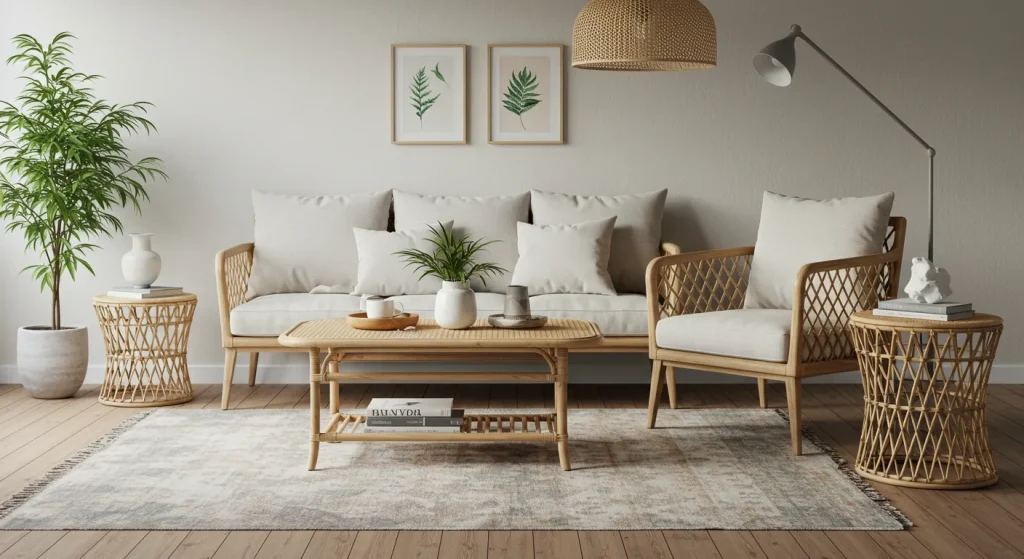 Adding rattan, bamboo, or wicker furniture enhances the light and airy aesthetic. Whether it’s a woven chair, coffee table, or side table, these natural elements instantly create a laid-back summer feel.