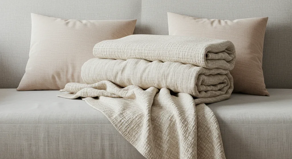• A very thin, open-weave cotton blanket is perfect for adding a layer of texture without adding too much warmth.