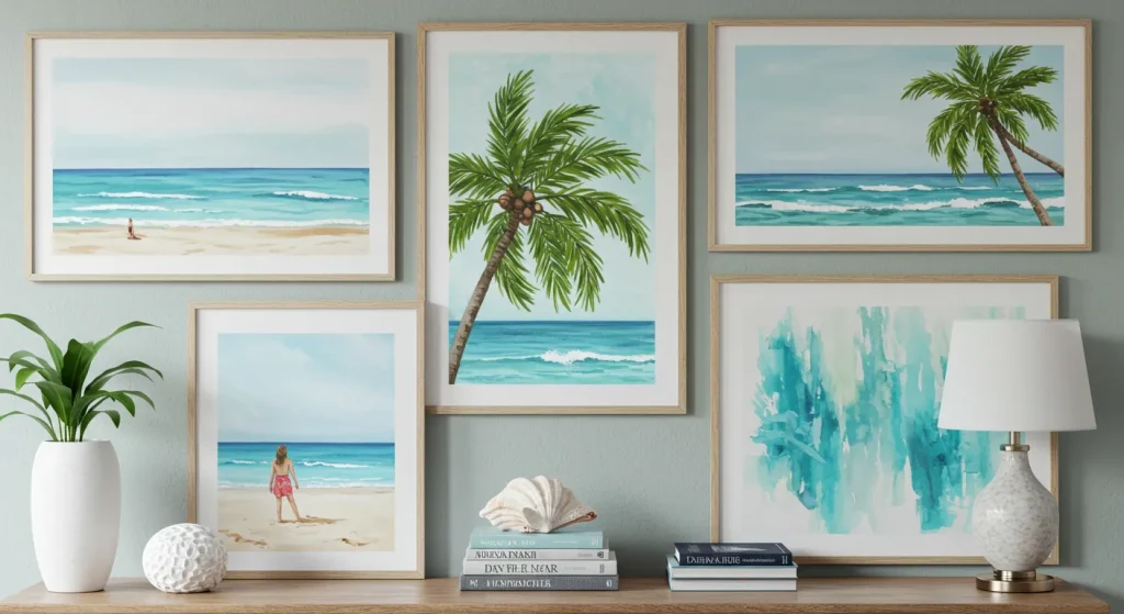 Switch out darker, heavier artwork for pieces that feature ocean views, palm trees, or abstract summer hues. A simple gallery wall with beach-inspired prints or watercolor paintings adds a seasonal touch.