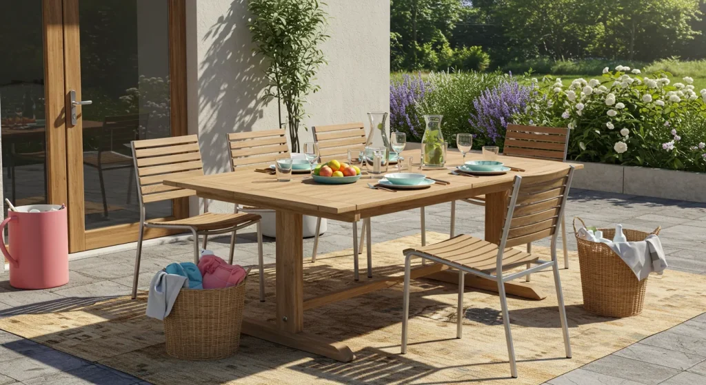 Create the perfect summer dining experience by setting up a stylish outdoor dining area. A wooden or metal dining table with comfortable chairs, paired with colorful tableware, makes mealtime outdoors more enjoyable.