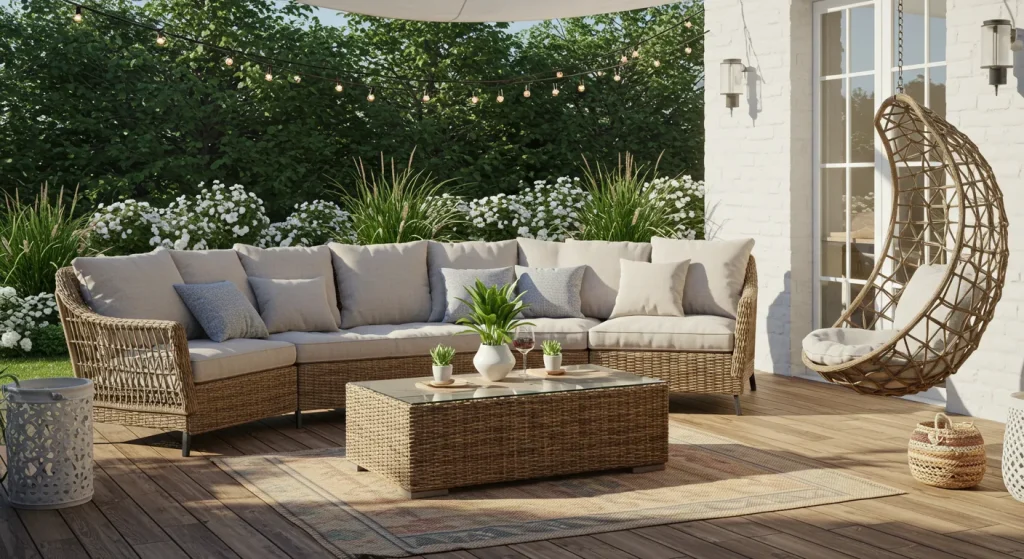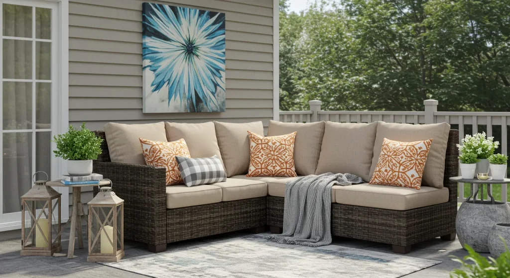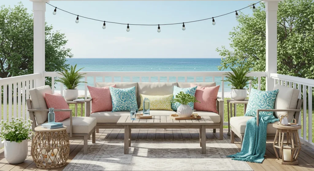 A summer patio should feel light and refreshing. Opt for soft pastels, ocean blues, and warm neutrals to create an inviting atmosphere. Adding colorful cushions, rugs, and throws can instantly brighten up the space.