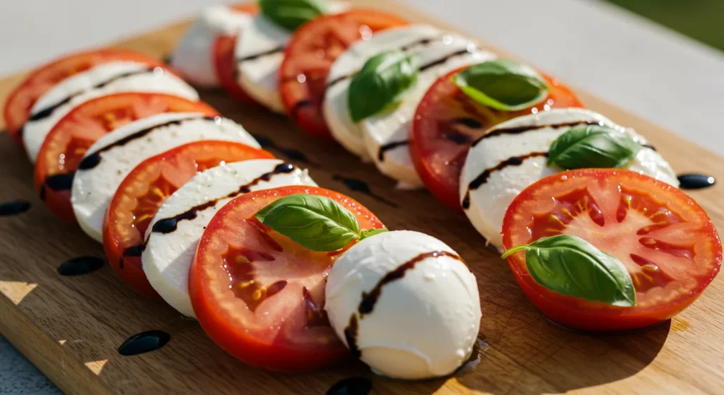 - On a large platter, arrange the tomato and mozzarella slices, alternating them in an overlapping pattern.