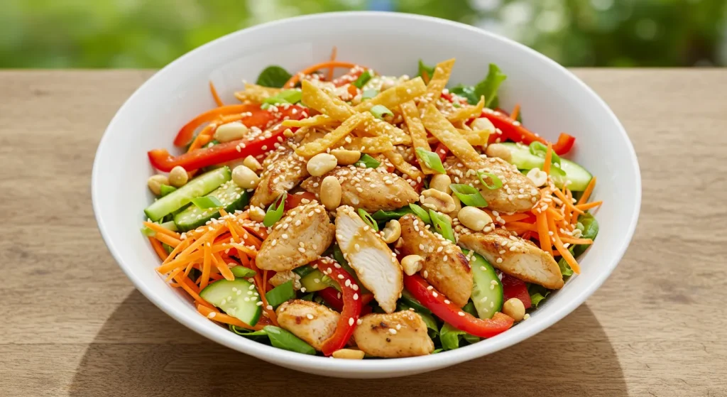 This salad is full of incredible textures and a vibrant, savory-sweet dressing. Using pre-cooked chicken and a bagged slaw mix makes it incredibly fast.