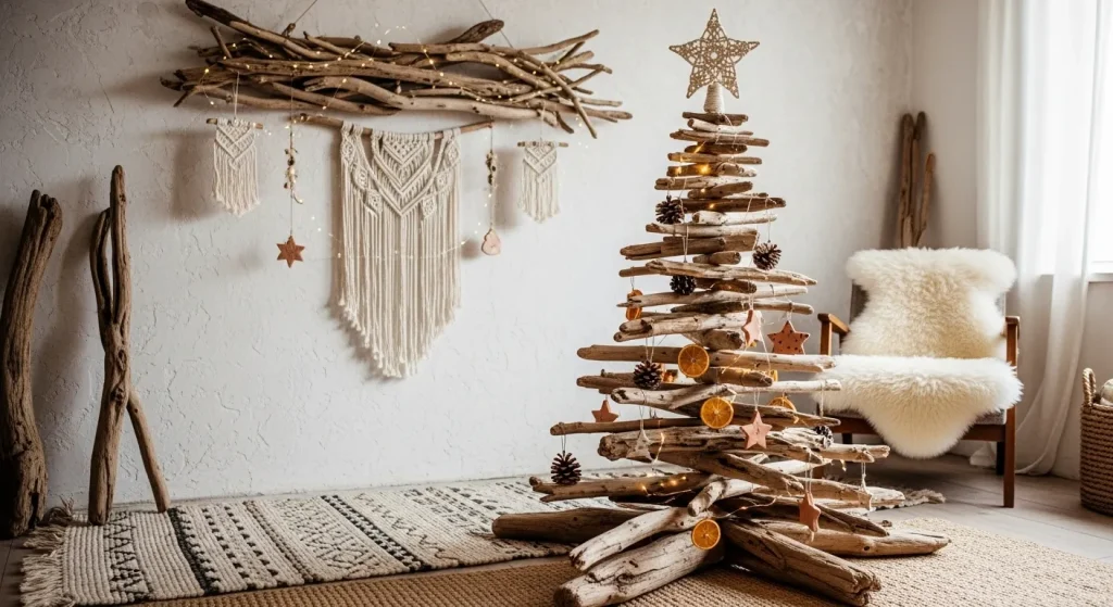 Driftwood Christmas tree or wall art offers coastal boho, using weathered wood to craft a unique, organic holiday accent that fits boho Christmas décor ideas. Lean against a wall, add lights, and pair with shells. I added this to a client’s coastal home, and the originality was captivating—boho and wild! This echoes Better Homes & Gardens’s driftwood trends. Seal for durability.