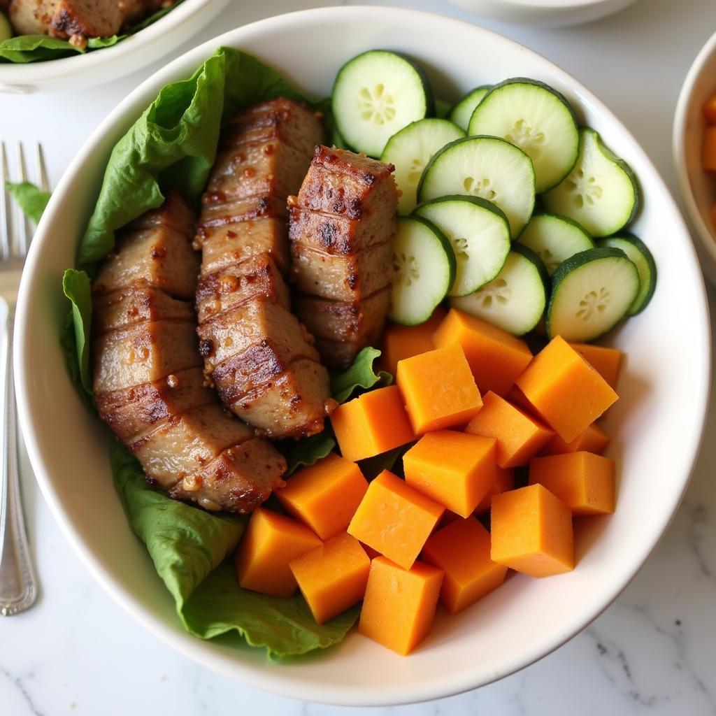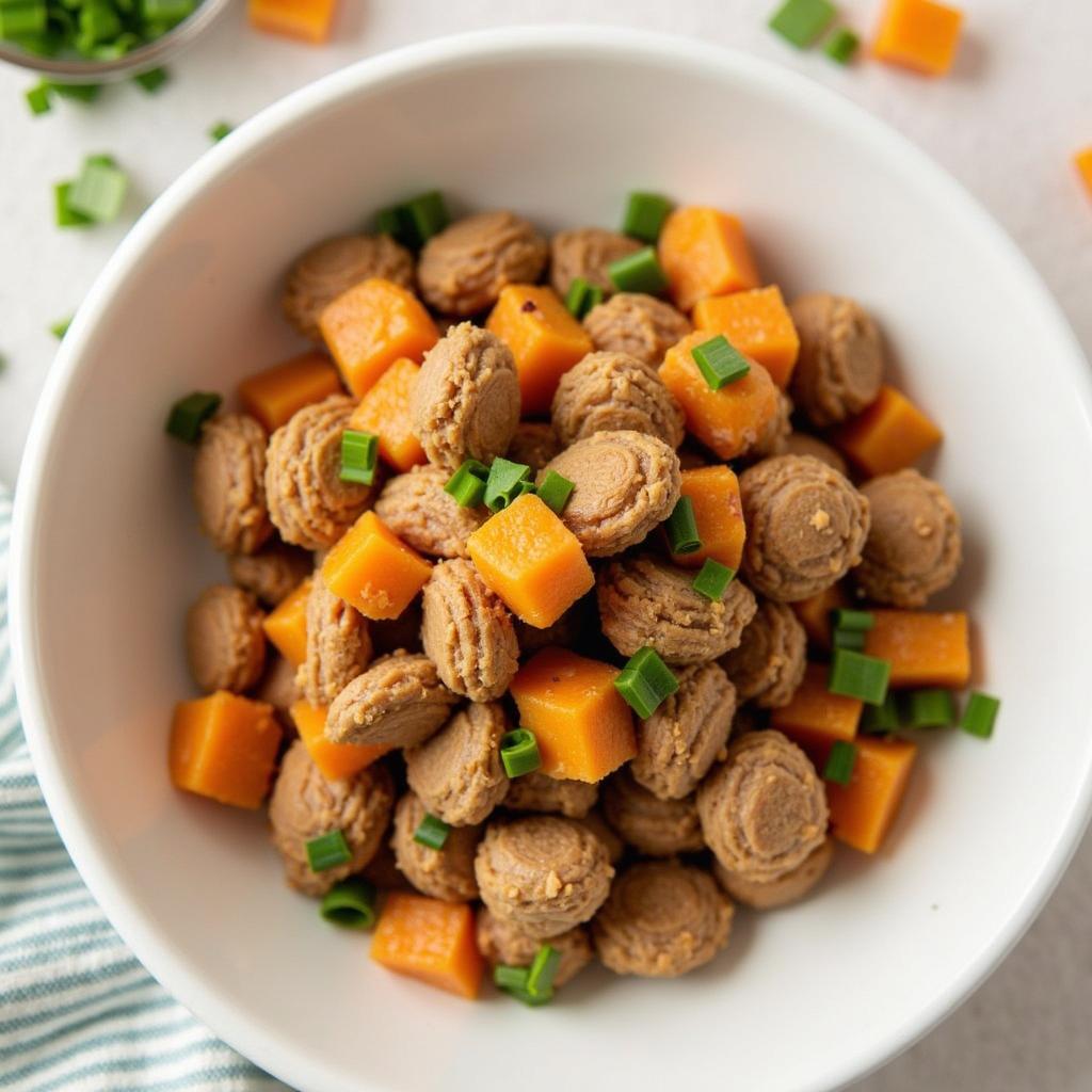 A flavorful bowl made with pork and sweet potatoes is a healthy and delicious choice for your dog.