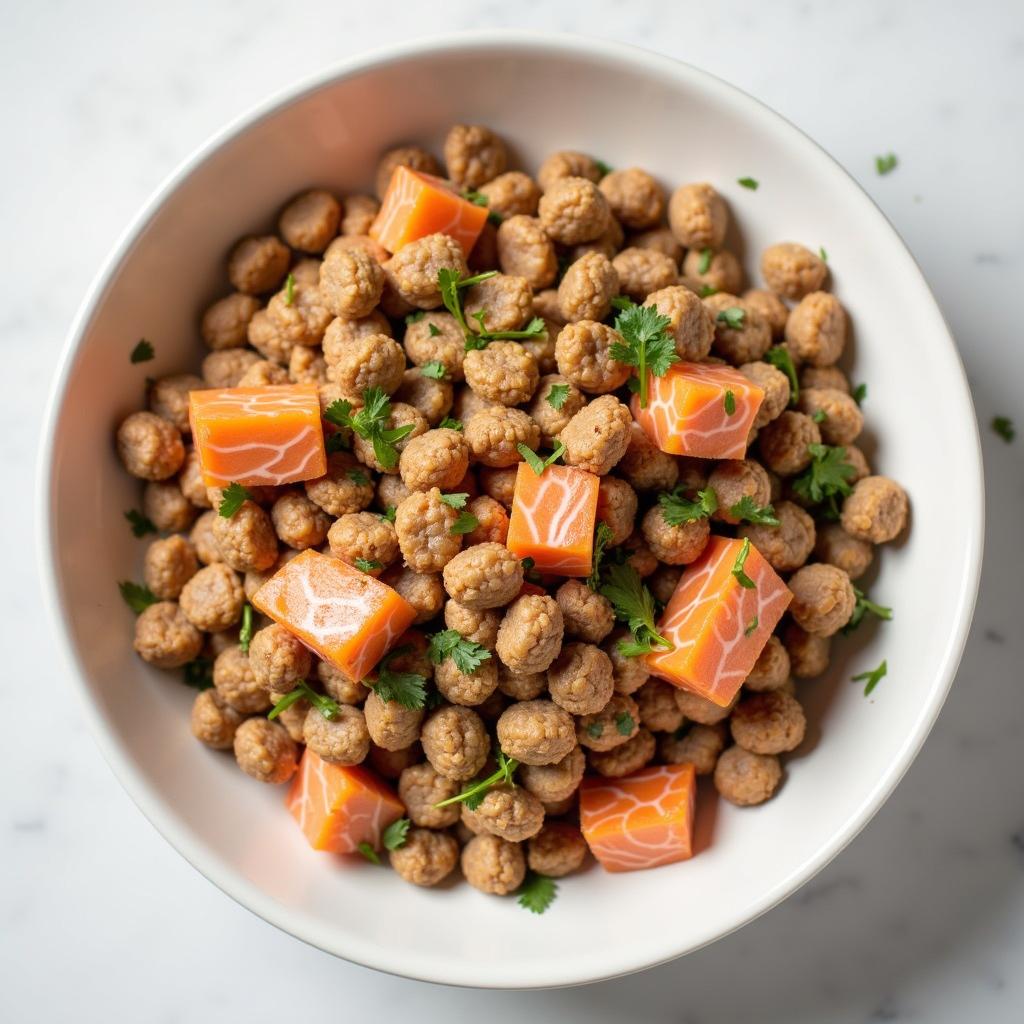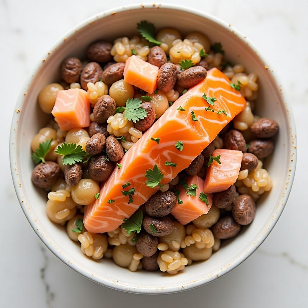 A healthy mix of salmon and vegetables that are packed with Omega-3 fatty acids for a shiny coat and healthy skin.