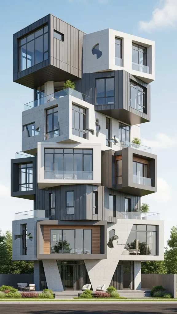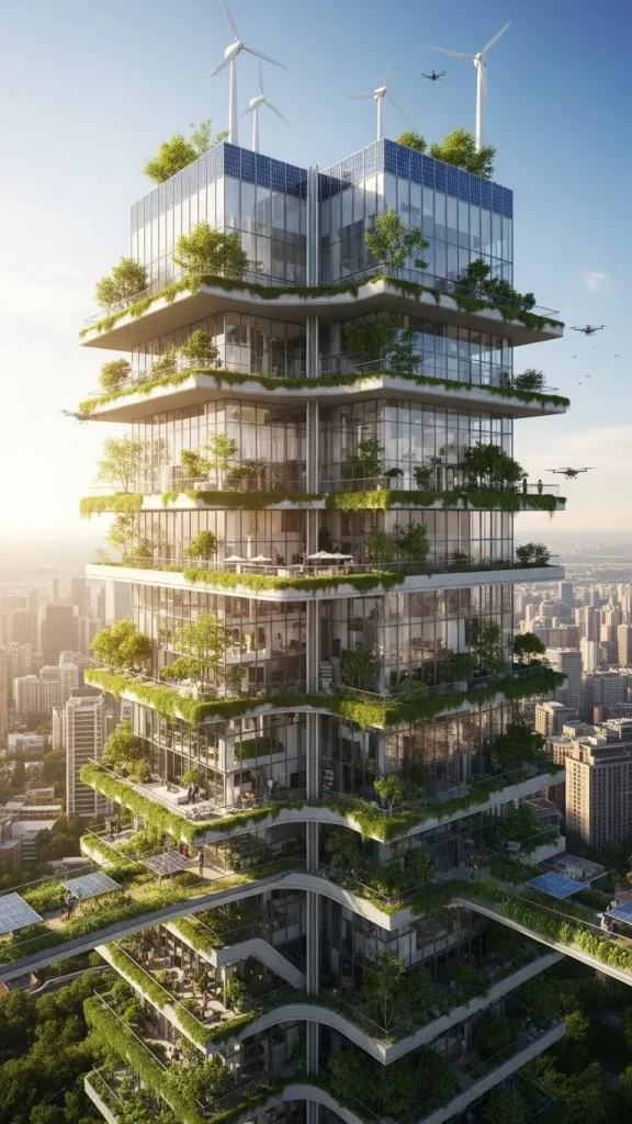 Featuring cantilevered floors and shifting volumes, this futuristic design creates a gravity-defying facade that offers natural shading and dynamic depth throughout the day.