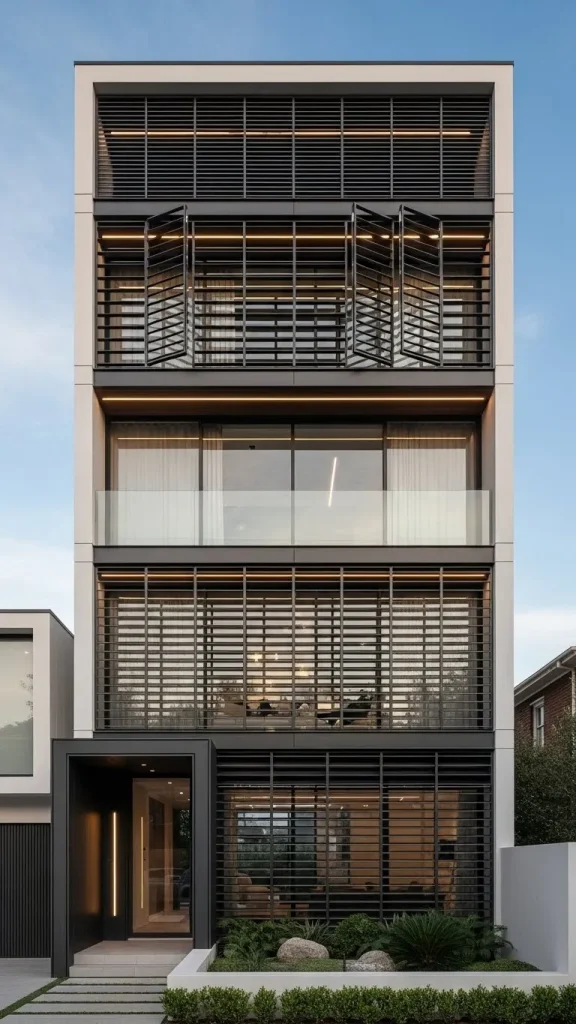 Utilizing adjustable wooden or metal louvers, this dynamic facade design balances essential urban privacy with natural ventilation and light filtration.