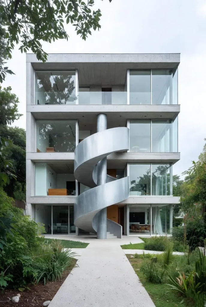 Acting as a functional sculpture, the external spiral staircase connects outdoor balconies to create a striking vertical focal point that serves as both a private entry and safety exit.