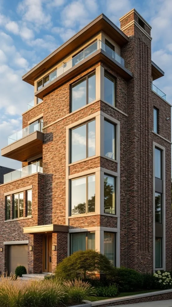 Reinterpreting traditional masonry, this design employs red or brown brick in innovative patterns to create a textured facade that bridges the gap between historic charm and modern utility.