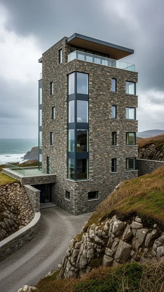 Balancing the visual weight of heavy masonry, this design pairs rough-cut or honed stone with strategic glass elements to create a secure, sound-insulated urban sanctuary.