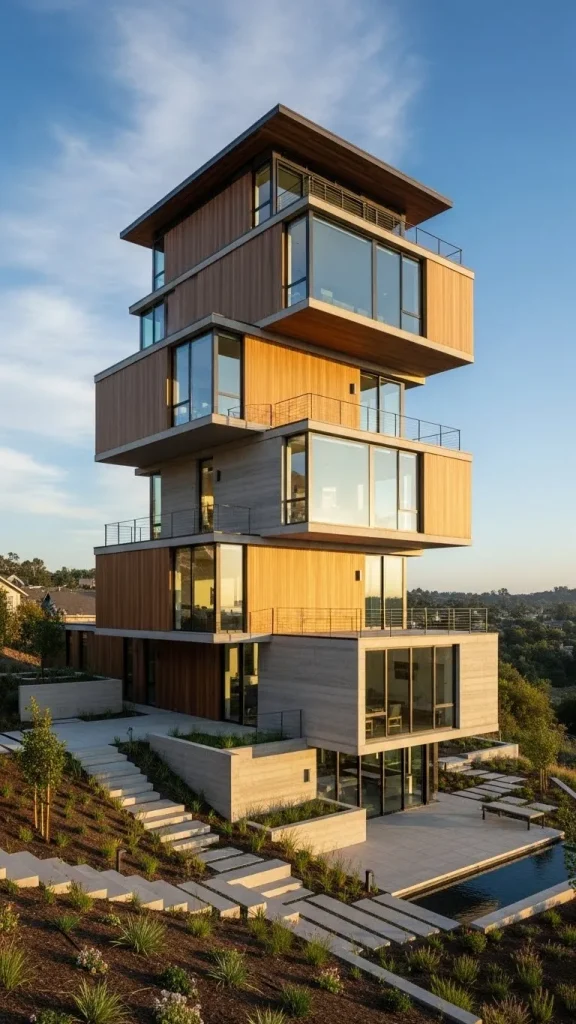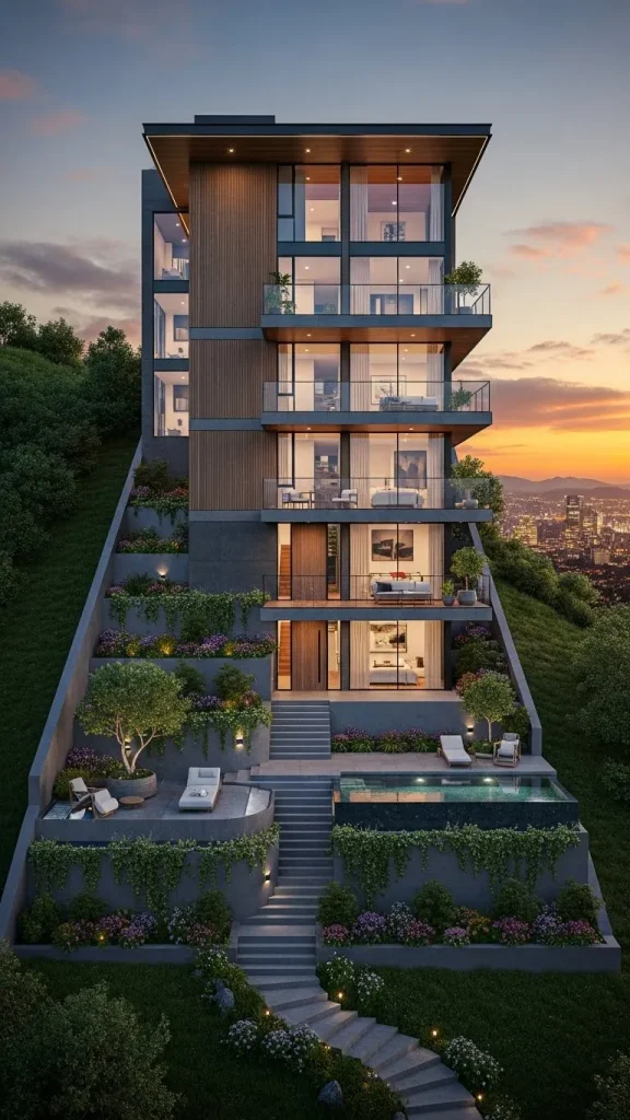 Ideally suited for sloping terrain, this stepped design hugs the landscape to provide every floor with direct ground access and unobstructed panoramic views. By integrating stone retaining walls and green roofs that double as gardens, the structure visually anchors itself to the earth for a grounded, organic aesthetic.