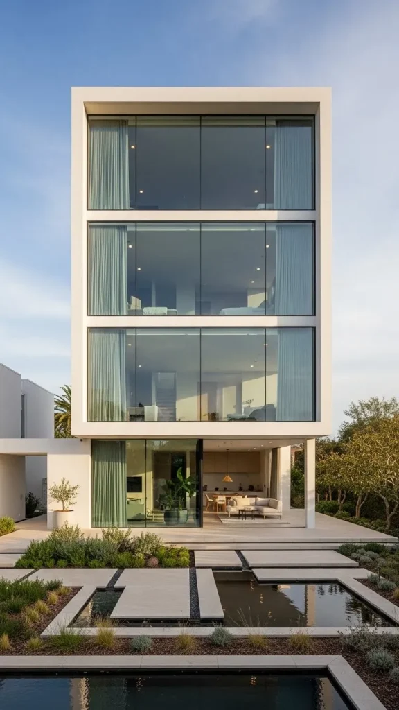 Modernizing coastal architecture, this design pairs crisp white stucco with sleek flat roofs and black steel accents to create a bright, climate-responsive facade that keeps interiors cool.