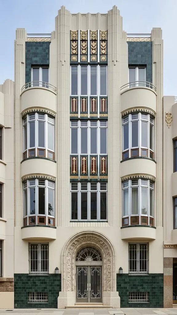 Channeling the glamour of 1920s skyscrapers, this Art Deco-inspired design emphasizes verticality through symmetric geometric motifs and decorative ridges that draw the eye upward.