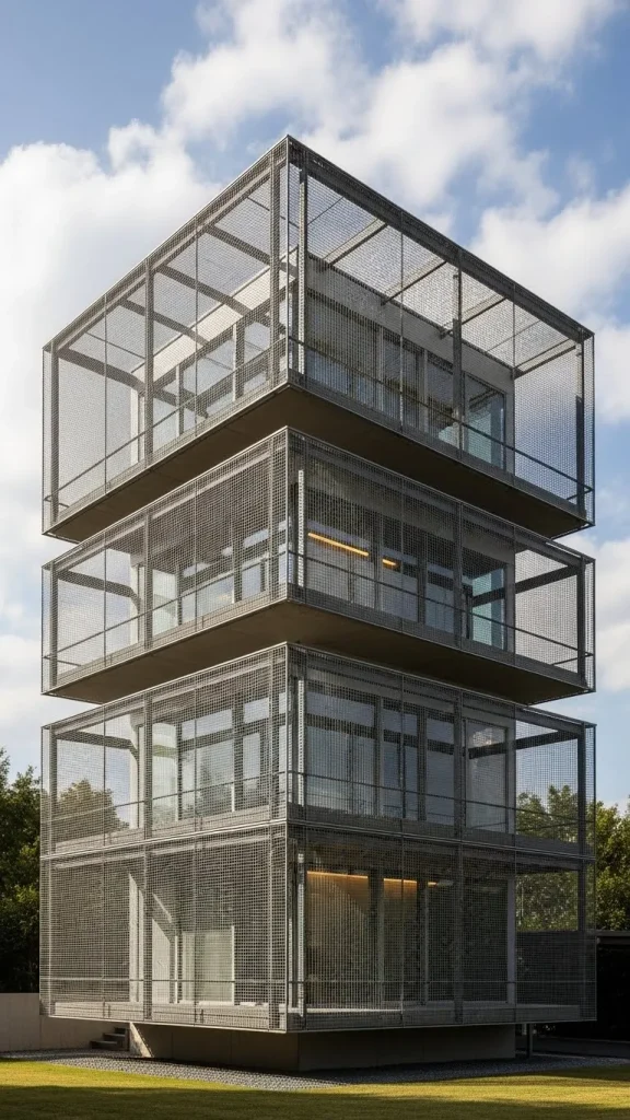 Encasing the home in a metallic mesh screen unifies the facade, creating a dynamic, semi-transparent second skin that provides both privacy and sun protection.