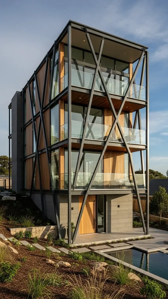 Showcasing engineering as art, this high-tech design features visible structural cross-bracing that provides seismic stability while defining a bold, industrial aesthetic.