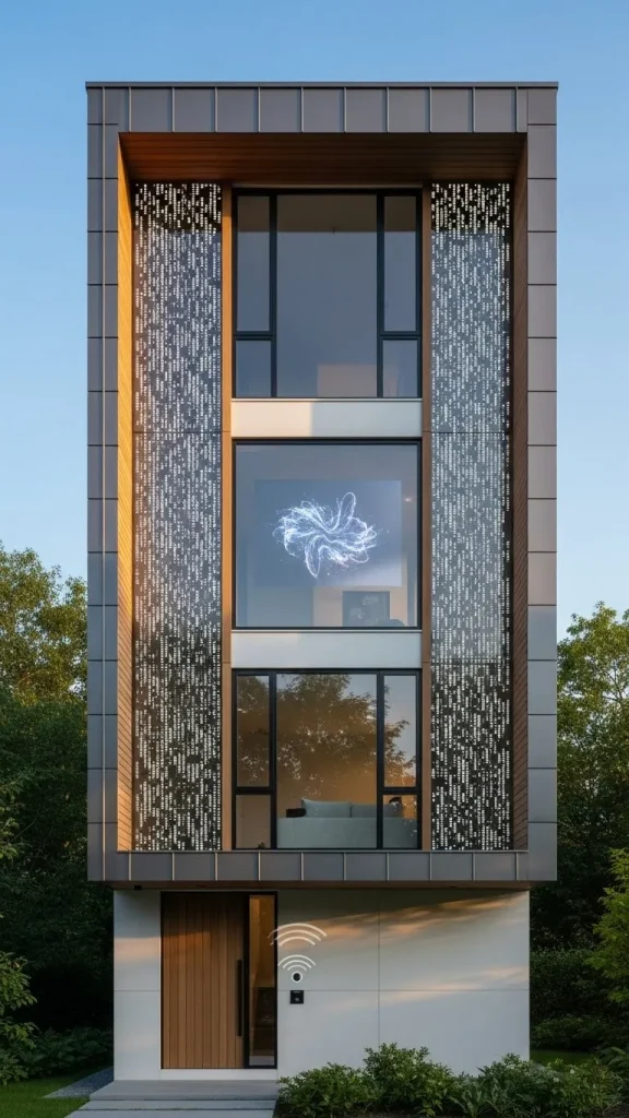 Redefining the home as a responsive living machine, this high-tech design employs kinetic panels and smart glass to adapt the facade in real-time for optimal light and privacy. Digital screens and projection mapping transform the exterior into a dynamic canvas, pushing the boundaries of modern residential architecture.