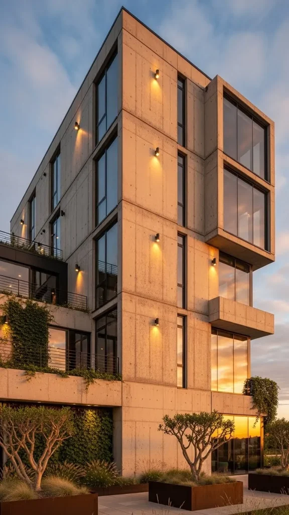 Embracing Brutalist architecture, this rugged design pairs raw exposed concrete with black metal windows to create a durable, low-maintenance industrial aesthetic. The textured grey facade resists harsh weather and develops a unique patina over time, eliminating the need for painting while providing a striking, fortress-like backdrop for landscaping.