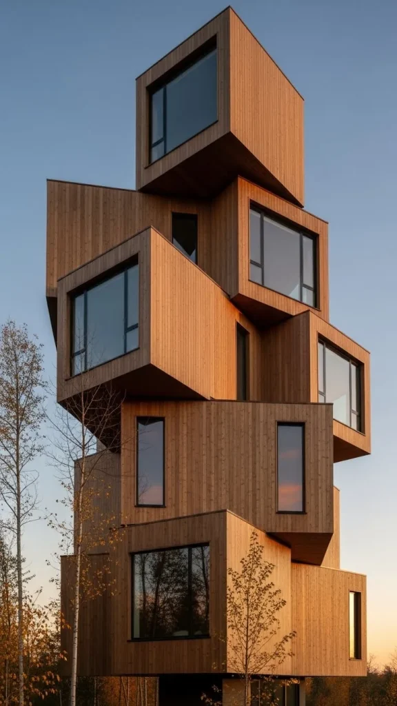 Softening the verticality of tall structures, modern timber cladding and horizontal slats create a warm, layered facade that visually reduces imposing heights. Sustainable treated wood ensures longevity and rich texture, allowing distinct stains to define different zones while offering superior durability over paint.
