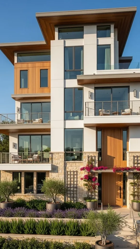 The integration of open terraces and glass-railed balconies maximizes outdoor living space while maintaining a sophisticated, uncluttered aesthetic. This breezy approach balances fresh Mediterranean charm with contemporary style, offering an inviting, airy atmosphere for vertical living.